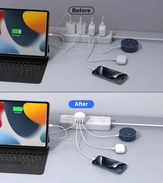 Compact and Portable: No need to repeatedly insert, the multiport charger can charge up to 4 devices at the same time. And provide you with a safe and fast charging experience. Its small size makes it easy to store in a bag, making it your best charging solution, whether you' re on business trip or traveling