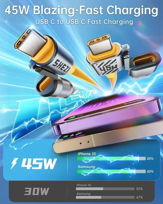 [45W Charges Your Devices Faster] Experience the next level of charging, our high-speed 45W USB-C to USB-C cable can assuredly power all your phones, ipads and Macbook at a faster speed fuels iPhone 15 series to 58% in just 30 minutes, Samsung S22 Ultra to 68%, MacBook Pro 16to 40% in just 45mins thats 38% faster than a 30W cable, notably knocks off your waiting time.