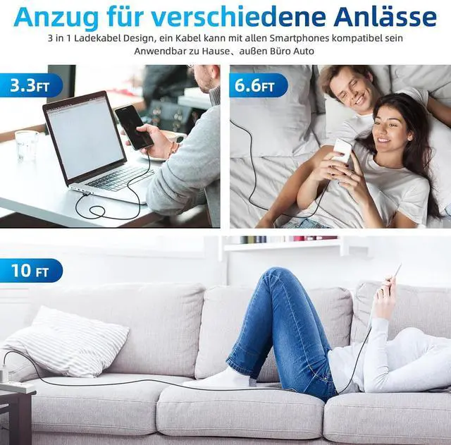 Universal and MultifunctionThis USB magnetic cable with 3 in 1 design, Equipped with 3 different types of magnetic tips which is Micro USB & Type C & iProduct, compatible with most devices. And combinations of three lengths [2X3FT+6FT+10FT] will meet your different charging need, no need to carry any other cables when you are in a car, office, or travelling.
