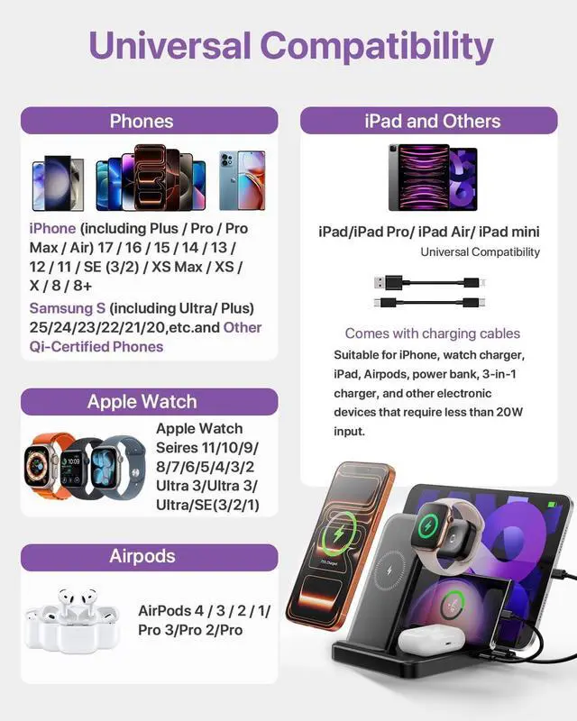 --: Experience seamless charging for all your essential devices with our 5-in-1 wireless charger. Designed for iPhone 17/17 Pro/17 Pro Max to iPhone 8 series, Apple Watch Ultra (1/2/3)/11/10/9/8/7/SE(1/2/3)/6/5/4/3/2, AirPods 4 with Active Noise Cancellation/3/2/1/Pro/Pro 2, iPad series, and Type-C devices, this station powers all your gadgets in one place. Eliminate tangled cables and enjoy effortless wireless charging in a sleek, organized setup.: //.