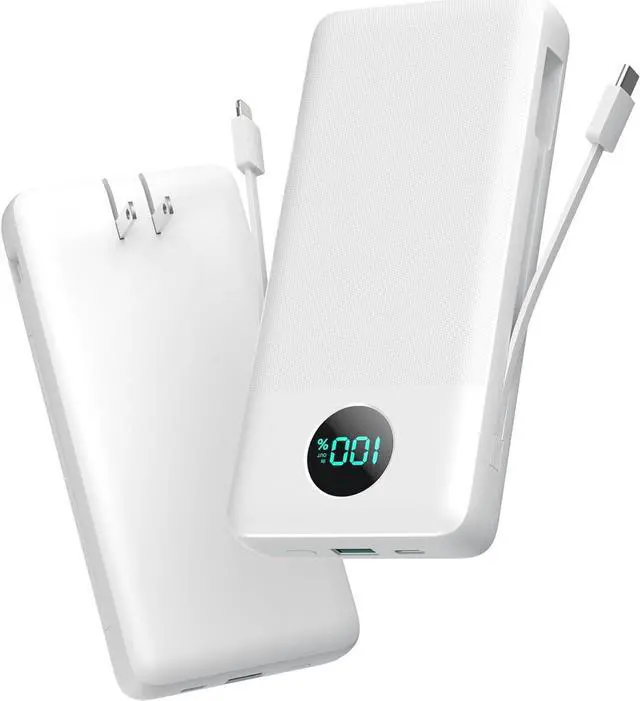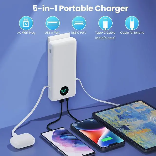 Cables & AC Wall Plug: 33800mAh portable phone charger built in 2 types cables, Type C and ios type cables, the AC Wall plug built in allows you to recharge itself directly from the wall outlet, do not need to carry adapter and cables everywhere any more. so you can travel light without worrying about charging woes with this battery pack.