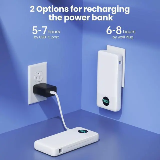 Power Bank with Wall Plug: There are two ways to charge this battery pack charger portable, one is recharging itself directly through AC wall plug(100-240V), which can fully recharge within 7-10 hours; The other is using Type-C Cable input, which can fully recharge within 6-8 hours. While the adapter charges your phone, it also charges the battery inside.