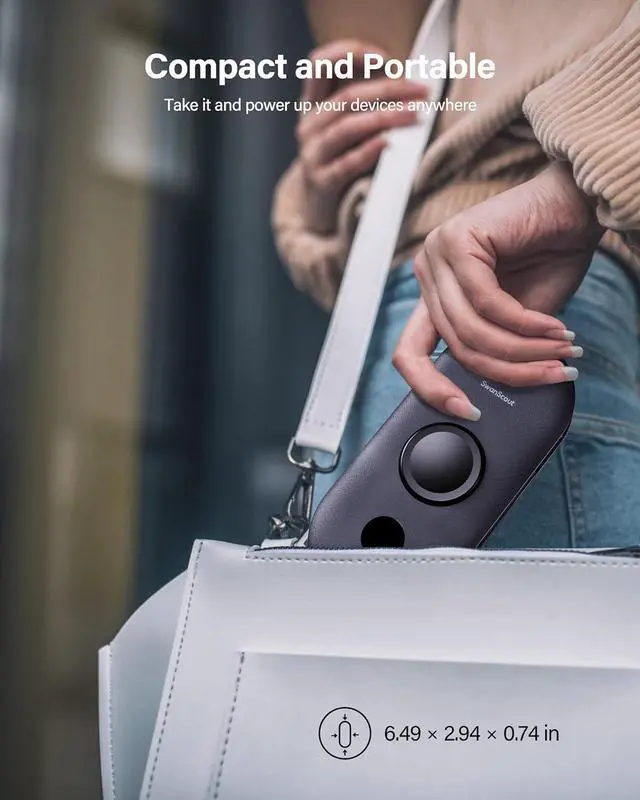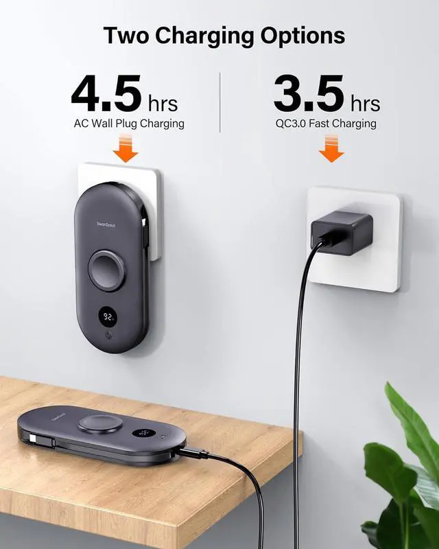 Built-in Cables & Wall Plug - SwanScout 302S features built-in cables for all phone types and a convenient AC wall plug. Additionally, it includes a USB-C port for fast charging and recharging (Note: The additional USB-C output is not compatible with iPhone 15 series). The built-in AC wall plug allows for direct charging from a wall outlet, eliminating the need for extra cords while traveling