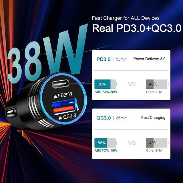 38W PD 3.0 +QC 3.0 Fast Samsung Car Charger: PD samsung galaxy S23 S22 ultra auto car charger adapter with 20W/3A Power Delivery 3.0 Port + 18W/3A Quick Charge 3.0 Port matches all devices fast charging. 4X faster than other 1A usb cigarette charger lighter. Type c fast car charger only takes 30 minutes to charge samsung a03s phone up to 60%. USB c car fast phone charger with Soft LED light indicator, you can pull and plug USB cable clearly at night.