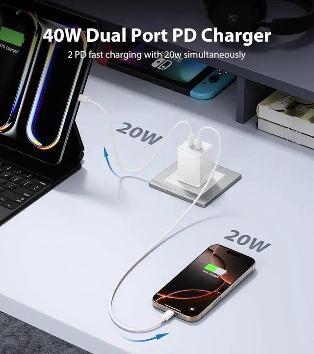 Dual Port Design Charger Cube: Two ports can fast charge two devices simultaneously at up to 20W, power up to 20W when a single device is connected. Boosted charging efficiency allows it to refuel iPad from 0% to 50% in only 40mins. (No cable included)
