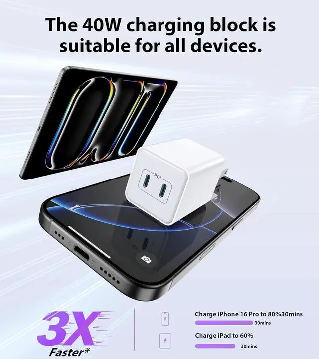 Fast Charging Block: 40W USB-C PD 3.0 fast wall charger, can charge your iPhone 16/15 from 0% to 50% in just 30 minutes, and can be fully charged in just 2 hours, 2-3 times faster than an 5w charger.