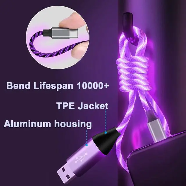 Enhanced Durability -- Strong TPE cover, the most flexible, powerful and durable material, makes tensile force increase by 200%. Can bear 50, 000+ bending test. Premium aluminum housing makes the cable more durable, light up type c cable adds additional durability and tangle free