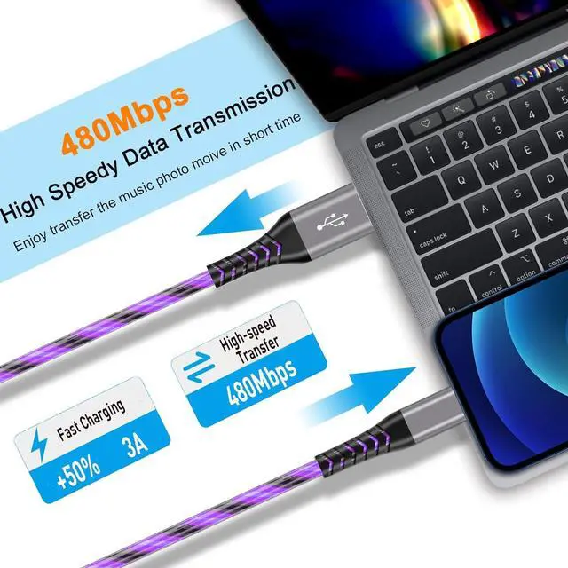 3A Fast Charging -- 3A fast charge, transfer speed reach 40~60MB/S (480Mbps), light up usb a to c cable accelerates the charging speed by delivering 5V/3A safe charging power, 25% fastercompared than other cables which provide 5V/ 2.4A output