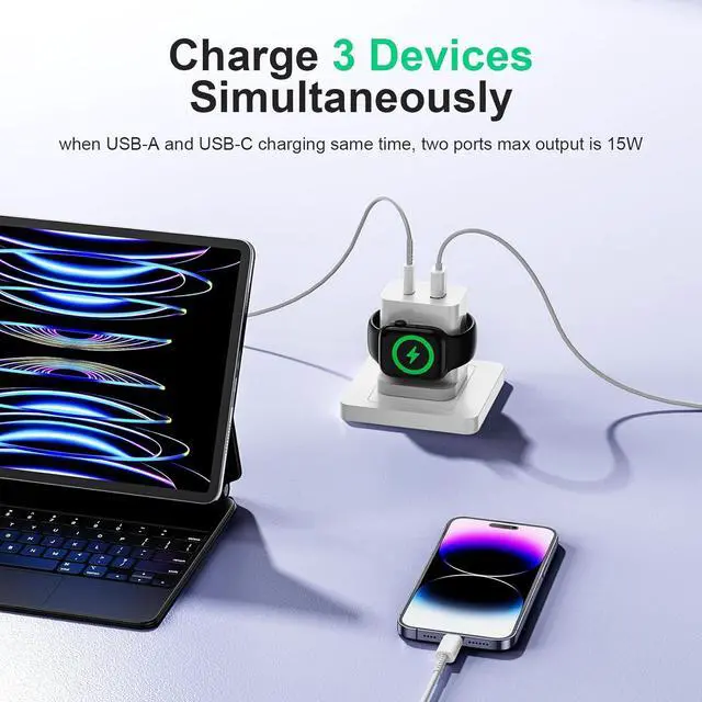 Charger: This charging block Support charging 3 devices simultaneously! built-in magnet and the magnetic function of apple watch charger for iwatch series 9/8/UItra/7/6/5/4/3/2/SE/Nike, also has 20W USB-C&18W USB-A dual ports. (Wireless charger only support for Apple Watch)