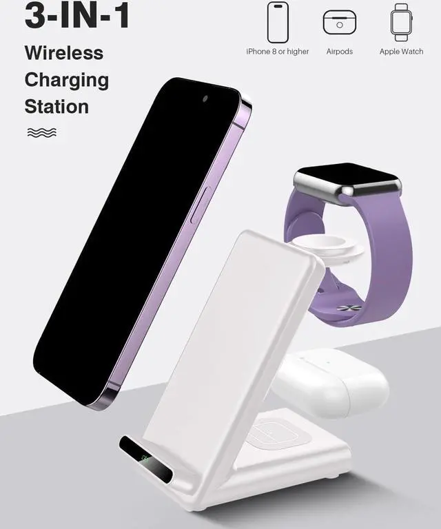 3 1: This all-in-one wireless charging station with dedicated spots made for your iPhone, for Apple Watch, and for AirPods/AirPods Pro, you can easily charge all your everyday accessories in one central location. Say goodbye to tangled cords and enjoy wireless charging by simply laying your phone on the charging stand, no more plug in/ out troubles.