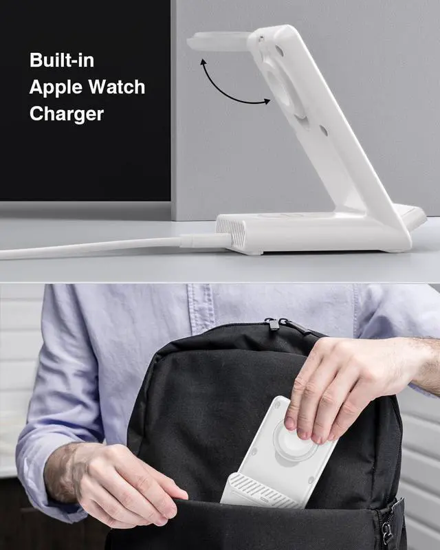 : This charging station made for apple devices includes a magnetic watch charger, no need to install yourself and keep your watch in place while charging. Designed with foldable watch charger, this charging dock fits perfectly into your home, office or travel; Just put it into your bag and take it anywhere.