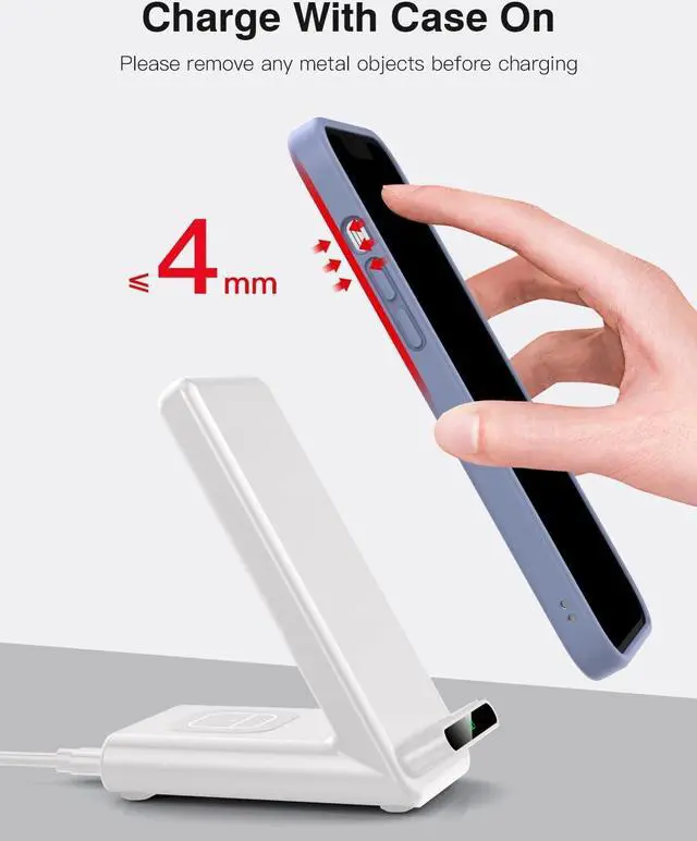 -: With over-current, over-voltage, over-temperature, short circuit protection, and foreign object detection function. Equipped with anti-slip silicone pads, fully protects your devices from scratches and sliding off while charging. Besides, the wireless charging stand can work with most cases up to 4mm, no need to remove your phone case before charging, but please remove all metal or magnetic attachments that would interfere with wireless charging.