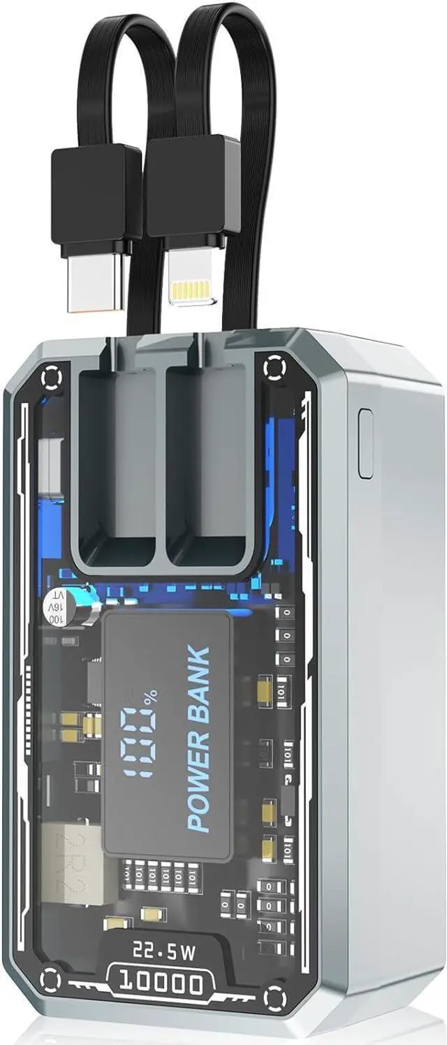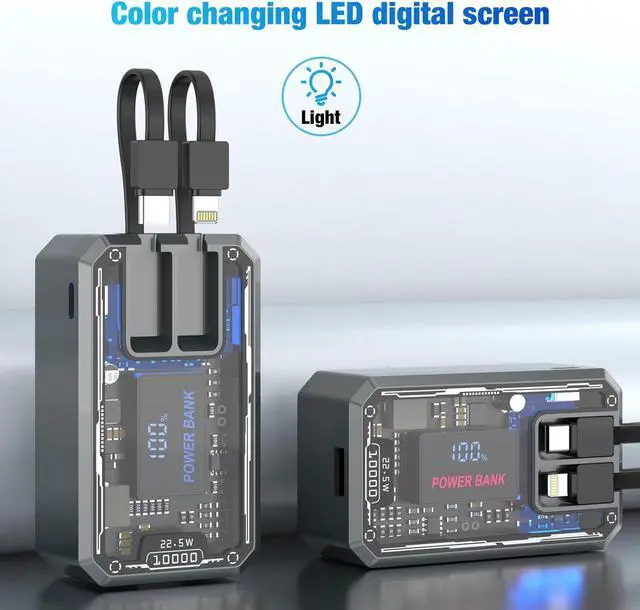 Small and lightweight: 10000mAh portable charger power bank with built in cables. Size of bank card. You can put in your pocket, clutch bag or purse handbag easil