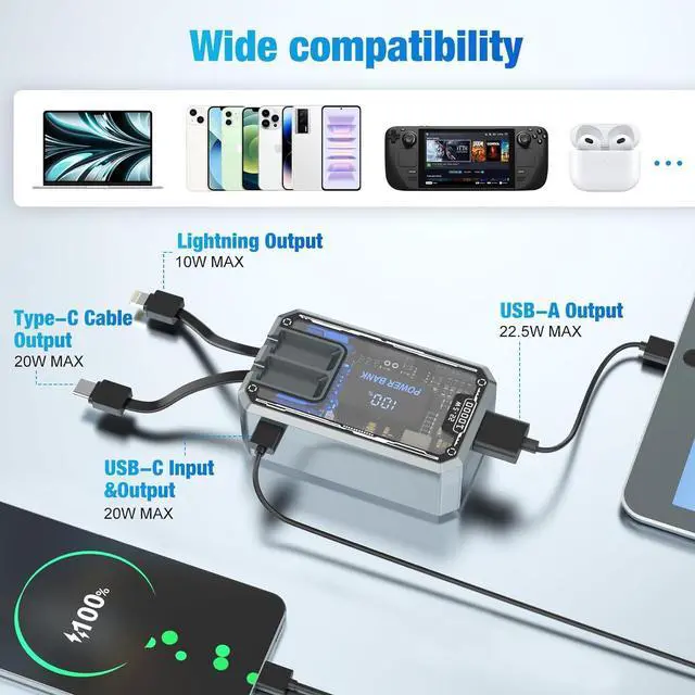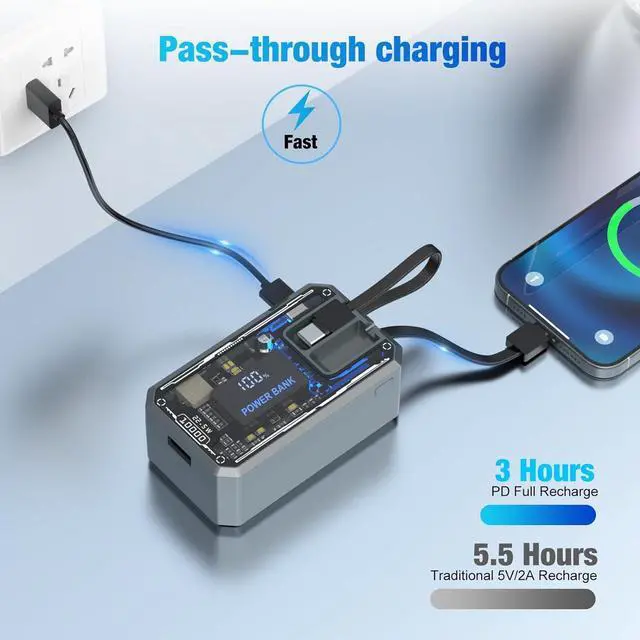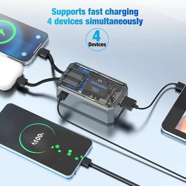 22.5W Fast Charging & Simultaneous charging 4 devices: The power bank has a PD 20W USB C port, a 22.5W USB A port, a max 22.5W type-c cable and a iphone cable max 10W. it can quickly charge 4 smart devices Simultaneously, twice faster than the normal portable charger power bank, saving more time for you. Charge for iPhone 13 (Samsung S10) to 60%(50%) only needs 30mins, universal compatible with iPhone, Samsung etc PD & QC 3.0 devices.