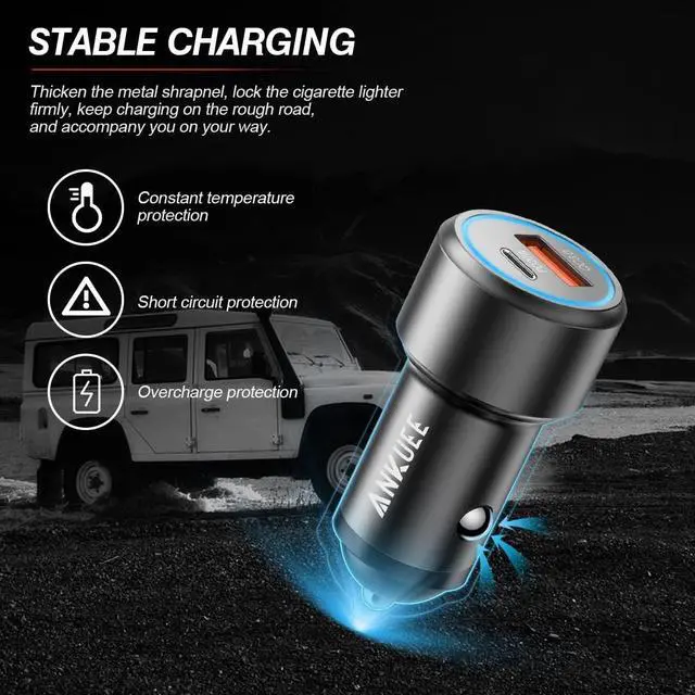 Top Material: This car charger is made of scratch and wear resistant aluminum alloy. Gold-plated circuitry reduces heat while charging to maximize charging speed and efficiency.