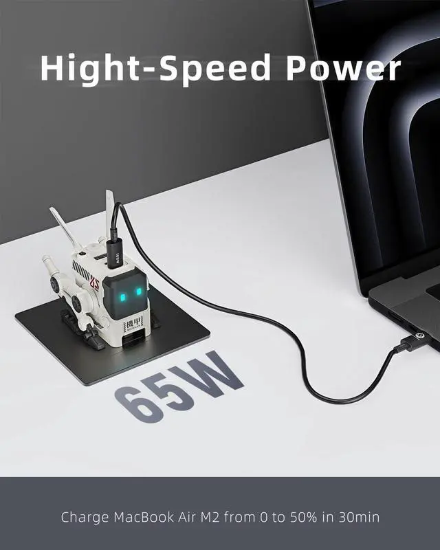 Fast 65W Charging CapabilityPowered by advanced GaN technology, Alpha65 can charge your MacBook Air from 0 to 51% in just 30 min with single 65W USB-C port. The Alpha65 is equipped with 3-ports (2 USB-C and 1 USB-A), the maximum total output is 65W when using 3 ports together or individually.