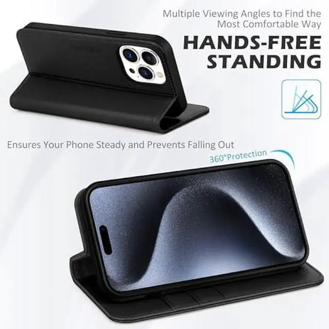 RFID BLOCKING TECHNOLOGY This iPhone 15 Pro Max wallet case combines the functions of a wallet and phone case. 1. It features 3 card slots and a full-length pocket to help you store driving license, cards and several cash. 2. Card slots are designed with RFID shielding technology that can block RFID signals and protect the personal information from unauthorized scanners