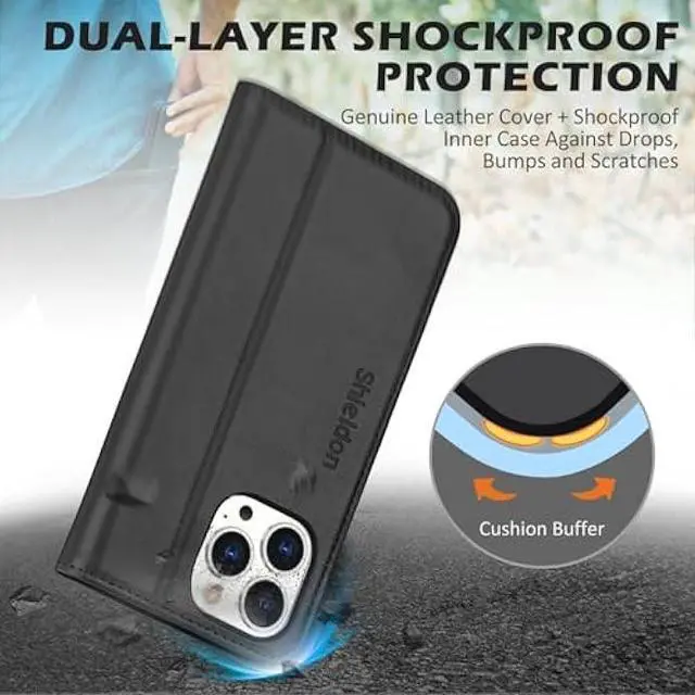 SUPERIOR PROTECTION 1. SHIELDON iPhone 15 Pro Max leather cases with delicate stitching are precision made of top layer cowhide leather. These hides are selected for quality, strength, character and grain. It will create a patina unique to you and your lifestyle as the leather ages over time. 2. Soft full-body interior shell comes with shockproof edge and ensures your phone against scratches, drops and bumps. 3. The increased lips around the lens protect your camera