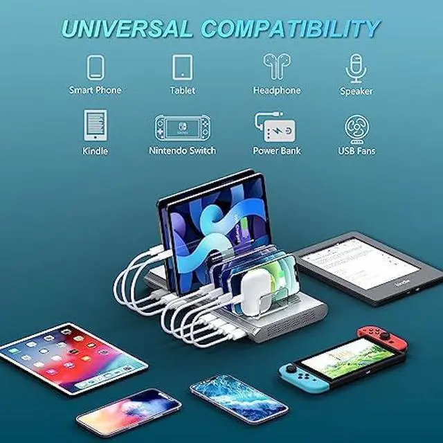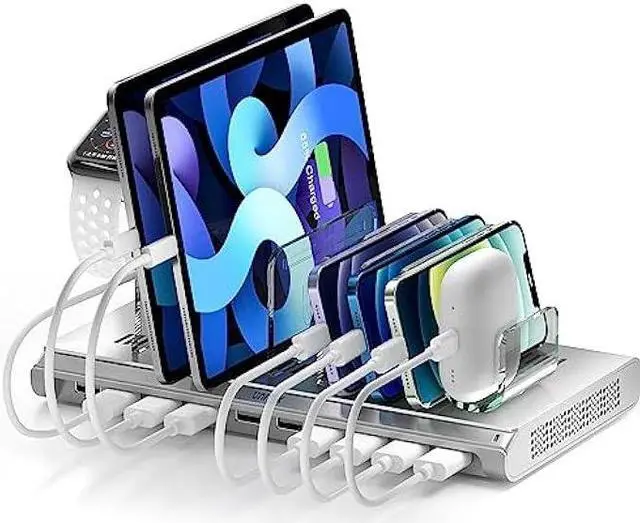Wide Compatibility: This multiple USB charging station is designed for compatibility with iPhone 14/13/12/11 Series, iPhone XS/XS Max/XR/X/8 Plus, iPad Pro/iPad Air/Air 2/iPad mini, Samsung, Huawei, LG, Sony, iWatch, Switch, Speaker, Power Bank, and other electronics.