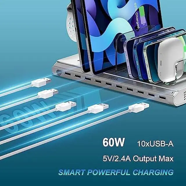 Multi-Port USB Charger Station: The Charging Dock Station features 10 USB-A ports, with each port built-in BC 1.2 protocol, providing up to 5V/ 1.5A per port. It also supports fast charging at 5V/ 2.4A for Apple devices. The total output power is 60W. This USB charging station allows you to charge multiple USB devices in one convenient location, freeing up your power outlets. It is perfectly compatible with your devices.