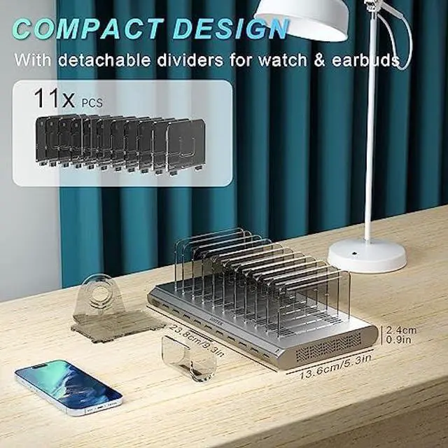 Removable Dividers: The Cell Phone Charging Station is designed with removable dividers and comes with 11 tall baffles. You can customize the assembly of the removable bezel to support thicker mobile phones or tablets. Additionally, it includes a new holder for iWatch & AirPods, allowing you to charge all your electronic devices in one place, keeping everything clean and organized.