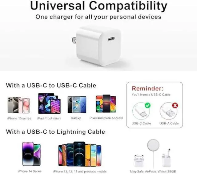 Excellent Phone Charger Block: Besgoods USB C charger works for iPhone series, simply solving the dilemma after buying a new phone without a proper power adapter. It's compatible with iPhone 17 Pro Max/17Pro/17/16 Pro Max/16Pro/16Plus/16/15 Pro Max/ 15 Pro/ 15/ 15 Plus/ 14 Pro Max/ 14 Pro/ 14 Plus/ 14/ 13 Pro Max/ 13 Pro/ 13/ 13 Mini/ 12/ 12 Mini/ 12 Pro/ 12 Pro Max/ SE/ 11/ 11 Pro Max/ XR/ XS Max/ X/ 8 Plus/ 8/ 7/ 6s.