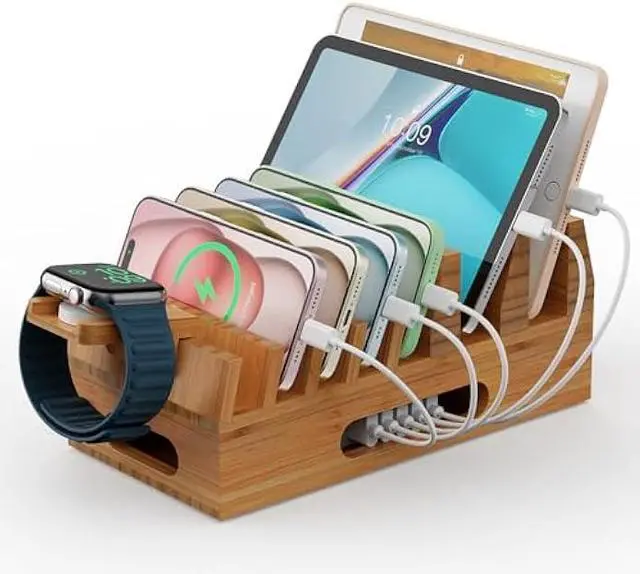 COMPATIBLE WITH MULTIPLE DEVICES: This bamboo charging station with Watch Dock Stand, is designed to charge up to your 7 devices simultaneously, matching to the universal lOS & Android cell phones, tablet, reader, and more devices