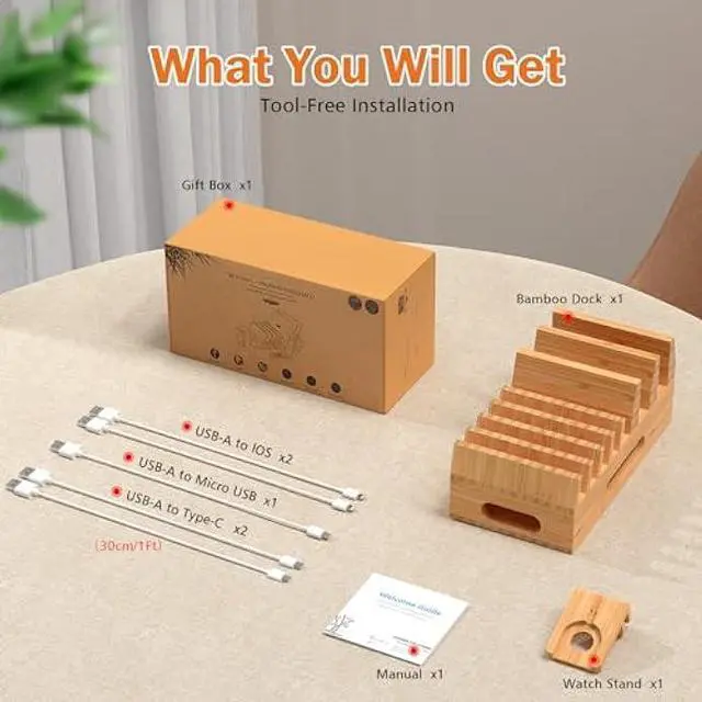 WHAT YOU GET: Pezin & Hulin 1 BAMBOO CHARGING STATION, 5 FREE CABLES, BONUS STAND (NO Power Supply Charger). An extra Hanging Stand for Watch, and Free Charging Cables (Included 2x 1OS cables, 1x Android cable, and 2x Type-C cables) (1Ft). All these fit perfectly in the charging dock