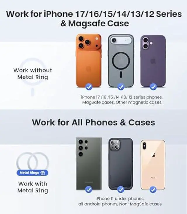 [Always Fit All Phones] Considering some phones and cases without MagSafe, we provide extra 2 metal rings. Once pasted, your phone/case can have the MagSafe function. Therefore, our tesla magsafe phone holder is compatible with all phones and cases. And the hollow design of the metal ring will not affect the wireless charging like other ordinary metal plates