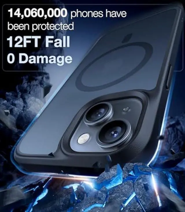 12FT MILITARY-GRADE FALL PROTECTION: Certified by ROHS. This iPhone 14/15 shockproof case has undergone more than 5, 000 12FT drop tests with the phone in, and the phone is finally intact. Thanks to the upgraded 3rd gen X-SHOCK 360° lens airbag with a tough PC matte back and soft flexible rubber bumper, it provides a strong buffer to prevent drops. The tiny design of 1.0 mm lips over the camera and 1.5 mm bezels over the screen prevent the screen and camera from dust and scratches.