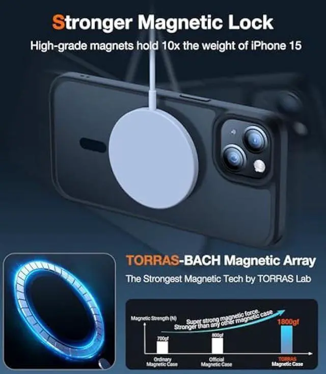 SUPER MAGNETIC LOCK: The TORRAS-BACH Magnetic Array can be firmly attached to the magnetic accessories. After testing, the magnetic strength is 90% higher than other magnetic cases. The TORRAS-BACH Magnetic Array ensures almost 0% power loss when charging wirelessly, making charging faster and safer. The iPhone 15 magnetic case and iPhone 14 magsafe case shorten your charging time and further improve your wireless charging experience.