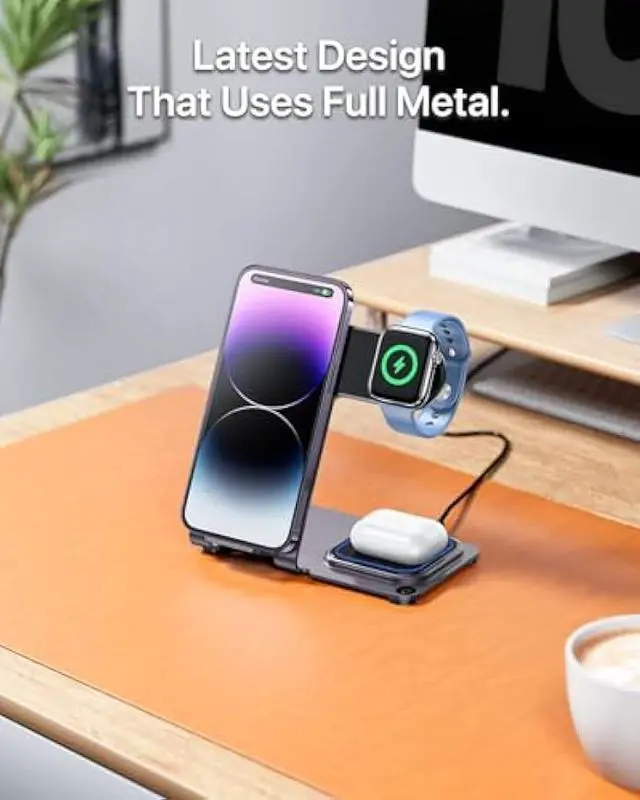 Save spaceOne charging device works for your iPhone, Apple Watch, and Airpods Pro. Suitable for home and office usage.