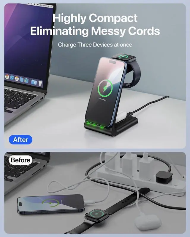 Simplify Life, One Cord at a TimeSay goodbye to cable clutter. One elegant charger replaces three tangled cords, bringing clean order to your nightstand, office desk, or living roomperfect for anyone who values a neat and organized space.