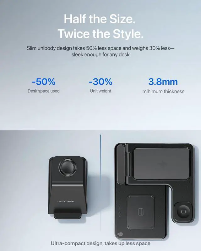 Compact Design, Effortless StyleHalf the size and 31% lighter than traditional docks, this slim wireless charger fits perfectly on your nightstand, desk, or in your travel bag. A minimalist 3-in-1 stand that keeps your iPhone, Apple Watch, and AirPods organized without taking up space.