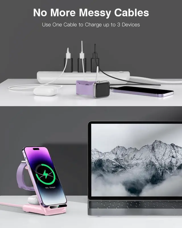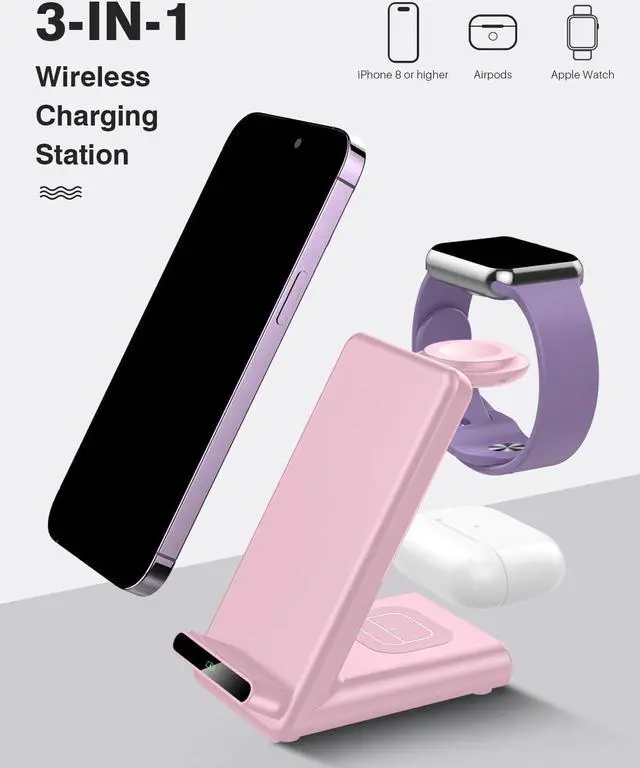 3 1: This all-in-one wireless charging station with dedicated spots made for your iPhone, for Apple Watch, and for AirPods/AirPods Pro, you can easily charge all your everyday accessories in one central location. Say goodbye to tangled cords and enjoy wireless charging by simply laying your phone on the charging stand, no more plug in/ out troubles.
