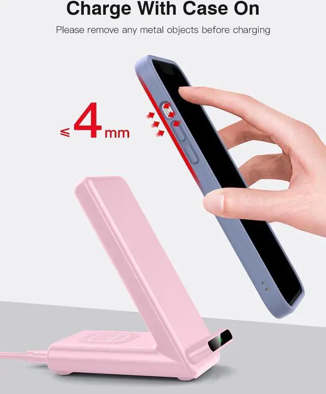 -: With over-current, over-voltage, over-temperature, short circuit protection, and foreign object detection function. Equipped with anti-slip silicone pads, fully protects your devices from scratches and sliding off while charging. Besides, the wireless charging stand can work with most cases up to 4mm, no need to remove your phone case before charging, but please remove all metal or magnetic attachments that would interfere with wireless charging.