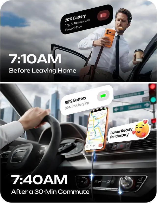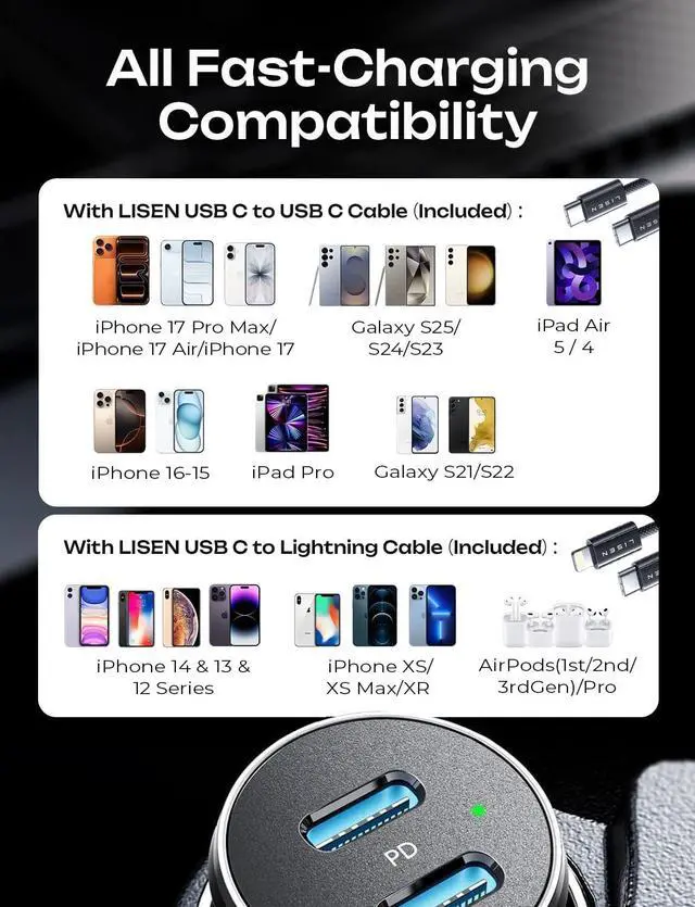90W TOTAL DUAL FAST CHARGING PORT LISEN iPhone 17 Fast Car Charger USB C is equipped with dual PD 3.0 fast-charge ports so that the maximum output is up to 90W in total. It supports PD 45W fast charging per port to any mobile device at the same time. 10X faster than 30W charger, can rapidly charge Samsung Galaxy S25/24/S23/Note charging from 0% to 80% in 30 minutes.