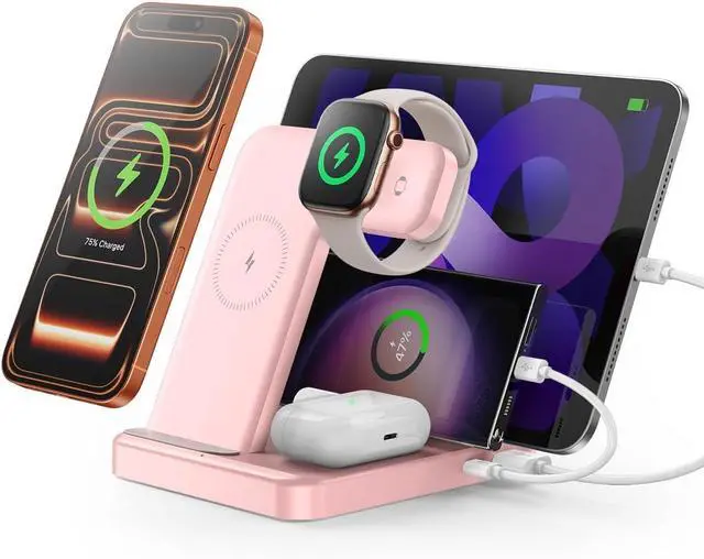 --: Experience seamless charging for all your essential devices with our 5-in-1 wireless charger. Designed for iPhone 17/17 Pro/17 Pro Max to iPhone 8 series, Apple Watch Ultra (1/2/3)/11/10/9/8/7/SE(1/2/3)/6/5/4/3/2, AirPods 4 with Active Noise Cancellation/3/2/1/Pro/Pro 2, iPad series, and Type-C devices, this station powers all your gadgets in one place. Eliminate tangled cables and enjoy effortless wireless charging in a sleek, organized setup.: //.