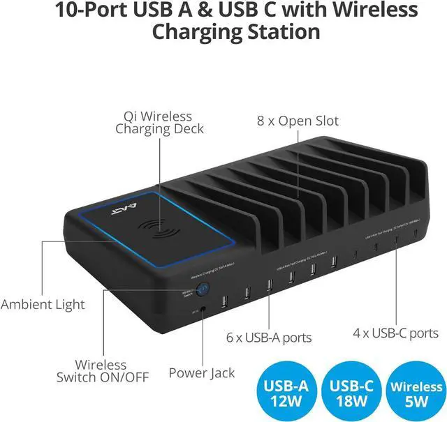 Up to 11 Devices Charging - Designed to support smartphones, tablets, and other USB devices. Power up to 11 devices simultaneously with a 150W charging capability, featuring 6 USB-A ports, 4 USB-C ports, and a Qi wireless charging platform.
