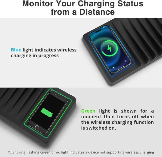 Wireless Charging with Ambient Light Signal - Conveniently charge your phones and earbuds within a second without having to plug in a cable and monitor the charging status with the ambient light signal from a distance. Compatible with AirPods, iPhones with Qi charging.