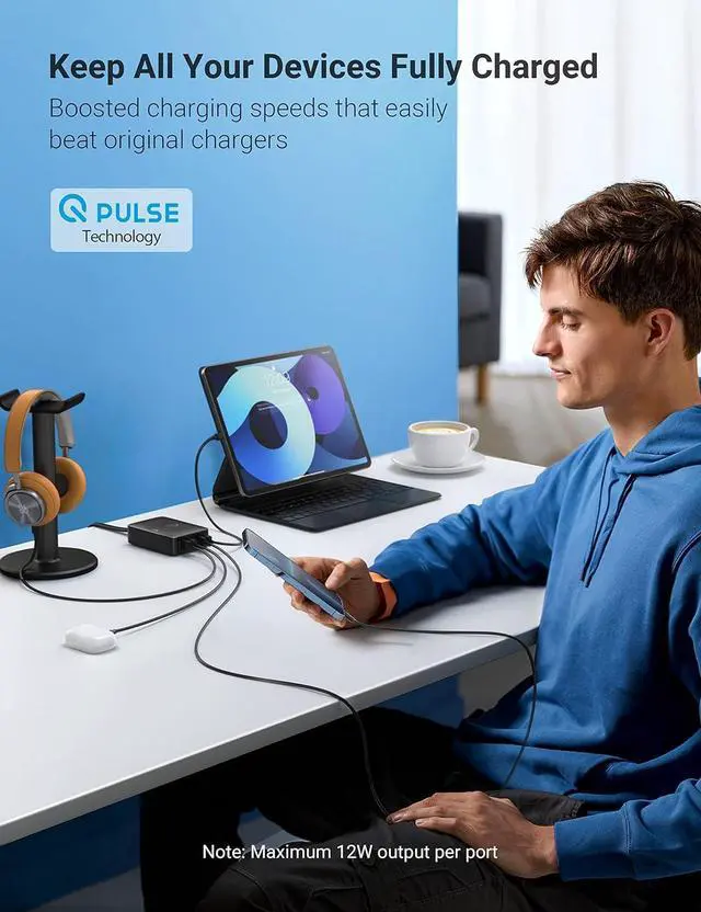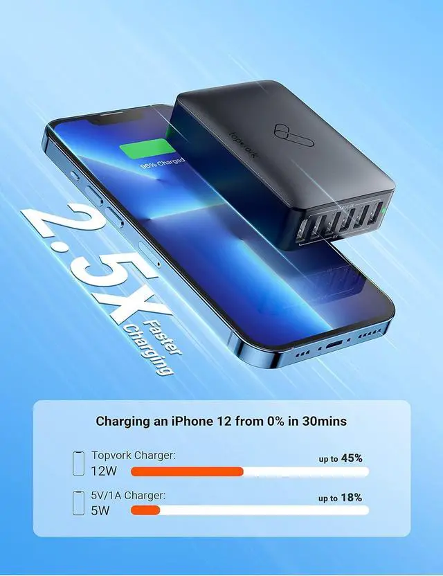 2.5 Times Faster: Advanced Q-Pulse charging technology provides safe, high-speed charging up to 2.4A, 2.5 x faster than a standard 5W charger and can power up for an iPhone 12 from 0 to 45% in only 30 mins