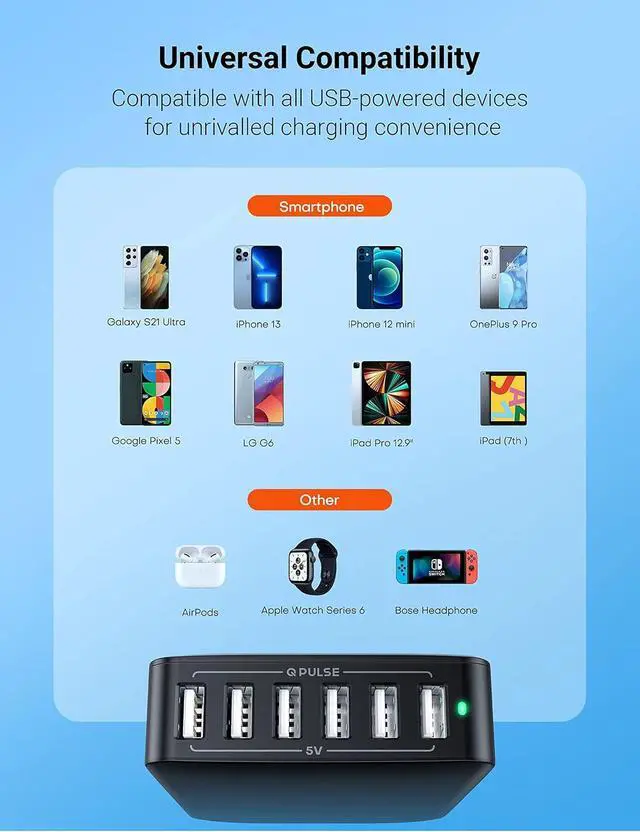 Functionality: A 6-port USB wall charger offers the flexibility to power up multiple devices simultaneously and keep all your devices well-organized and uncluttered