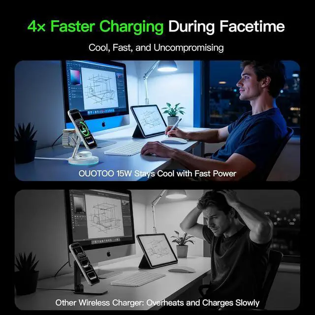 Excellent design concept: OUOTOO solves user pain points. When you are still struggling with a pile of charging cables and charging heads on a messy desktop, this 3-in-1 magnetic charging station solves your troubles. Its powerful compatibility supports mobile phones, watches, and headphones, and can be easily charged by simply placing it on. It also comes with cool LED lights, and we strongly recommend that you have it