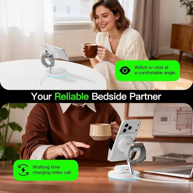 Upgrade Powerful Mag-Safe Charger Stand3 in 1 Mag-Safe charger makes fast charging safe and easy. The built-in super strong magnet makes alignment instantly and precisely, just 1 second to achieve lightning fast wireless charging. The magnetic charger can hold your iPhone horizontally and vertically, or in any directions, the phone charging area can adjust the angle by 360°, you can enjoy all your comfortable viewing from any angle. Gently touching the touch switch can turn off or on the smart LED indicator light