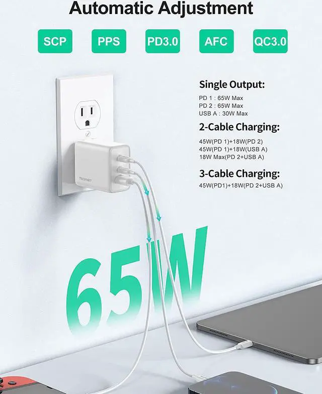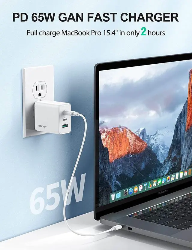 TOTAL OUTPUT: Offers 65W Power Delivery 3.0 charging from a single USB-C port powers up your MacBook Pro 15.4 from 0% to 100% in only 2 hours via a USB-C to USB-C cable (NOT INCLUDED) or other compatible USB-C powered devices that support USB Power Delivery. TECKNET's iconic PD 3.0 With PPS technology can provide high-speed charging for most mobile devicesMINI