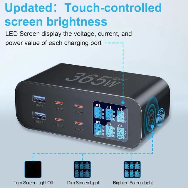 Display Screen: The charging station has four USB-C PD ports and two QC 3.0 USB-A port so you can fast Charge for six devices at once. The charger With the high-resolution LED digital display you can visually monitor the current Voltage and Power of 6 Ports at same timeThe screen brightness adjustment has been upgraded easily switch between three brightness levels using the touch button on the right side.