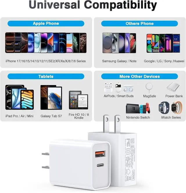 ChargersHigh-Speed Charging: The USB-C port supports a maximum power output of 20W. Dual-port design with USB-C and USB-Acharge two devices at the same time to minimize waiting time and frees you from messy chargers with various interfacesUniversal