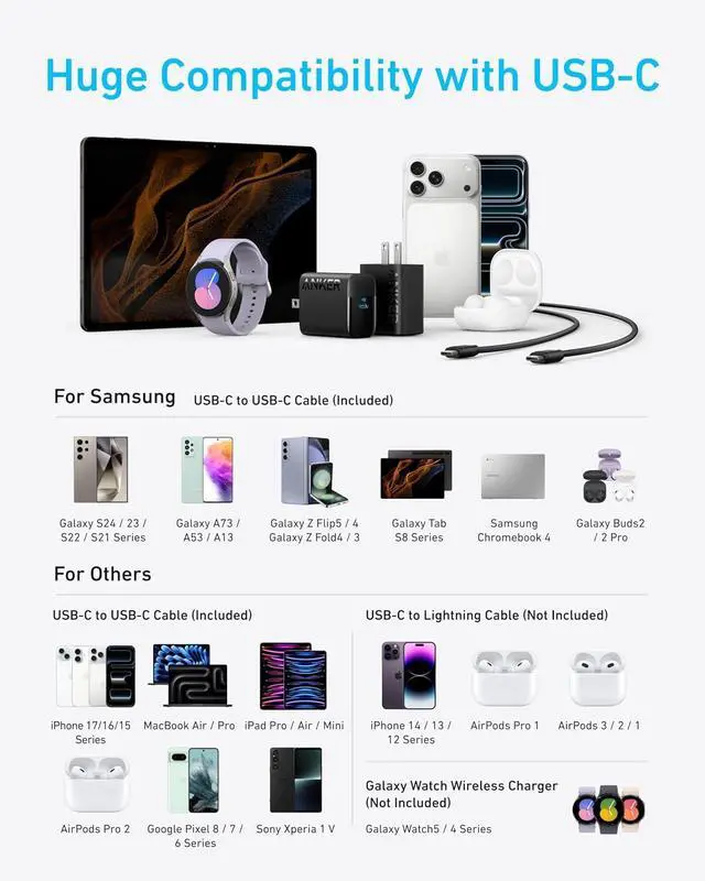 Universally Compatible USB-C Charger: Embrace the convenience of this versatile USB-C charger compatible with a broad range of and other USB-C devices.
