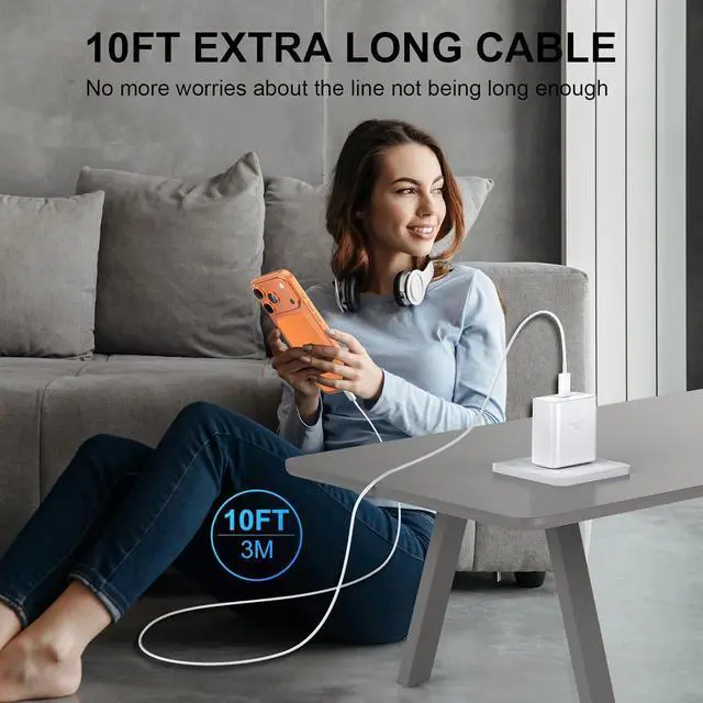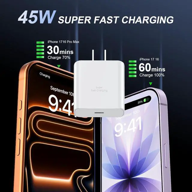 Charger Fast Charging: The 45W iPhone 17 16 Fast Charger USB C Block with 10ft extra long USB C to USB C fast charger cable cord provide Max 45W output power charge your iPhone 17 16 Pro Max up to 70% in just 30mins 6X faster than the original 20W USB C charger10Ft USB C iPhone 17 16