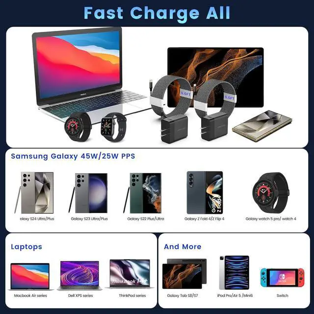 Type C Cord: S24 S25 ultra charger kit for come with 2pack 6.6 ft/2m 100W Type-C charger fast charging cord meticulously crafted with premium nylon braiding. The tangle-free cables provide the ultimate convenience allowing you to comfortably charge your device from the comfort of your bed couch or office. Enjoy unparalleled flexibility and durability with super charger fast charging cord for. Universally Compatible